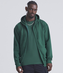 Soft cotton faced fabric. Brushed back fleece. Drop shoulder style. Double fabric hood with self colour drawcord. Full length covered plastic zip. Front pouch pockets. Heather grey 75% ringspun cotton/25% polyester. 590g